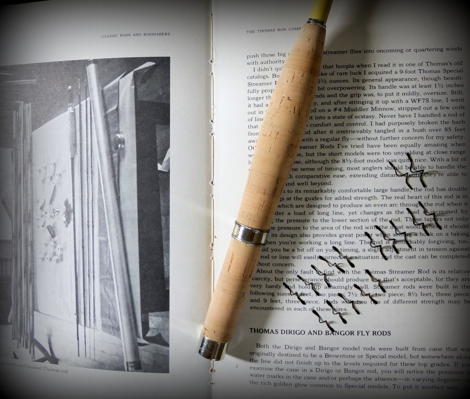 だいぶ前に「コレ作りたいね」と話をしていたのが再燃して画像を探したら出てきた..WS所有の.Thomas & Thomas / Custom Baitcast Rodである。フライ釣りしかやらない私もこのロッドの「道具としての美しさ」に目を惹かれた。1983年頃のカタログで見かけたときはストレートのグリップ&シートだったけど、その後すぐにトリガー付きの「粋な」グリップに変更された。リールシートは80年代にT&Tバンブーで使われていたもので、フォアとリアグリップの延長上から一段下げた状態で固定されている。リールから繰り出されるラインとガイドをなるべく平行にするという意図が窺われる。「カスタム」と言うくらいだから製作本数は少なかったと思う。吊り下げ固定専用の金属部品もひとつひとつ作ったのだろうか?細身のトリガーも美しいカーブを描く...