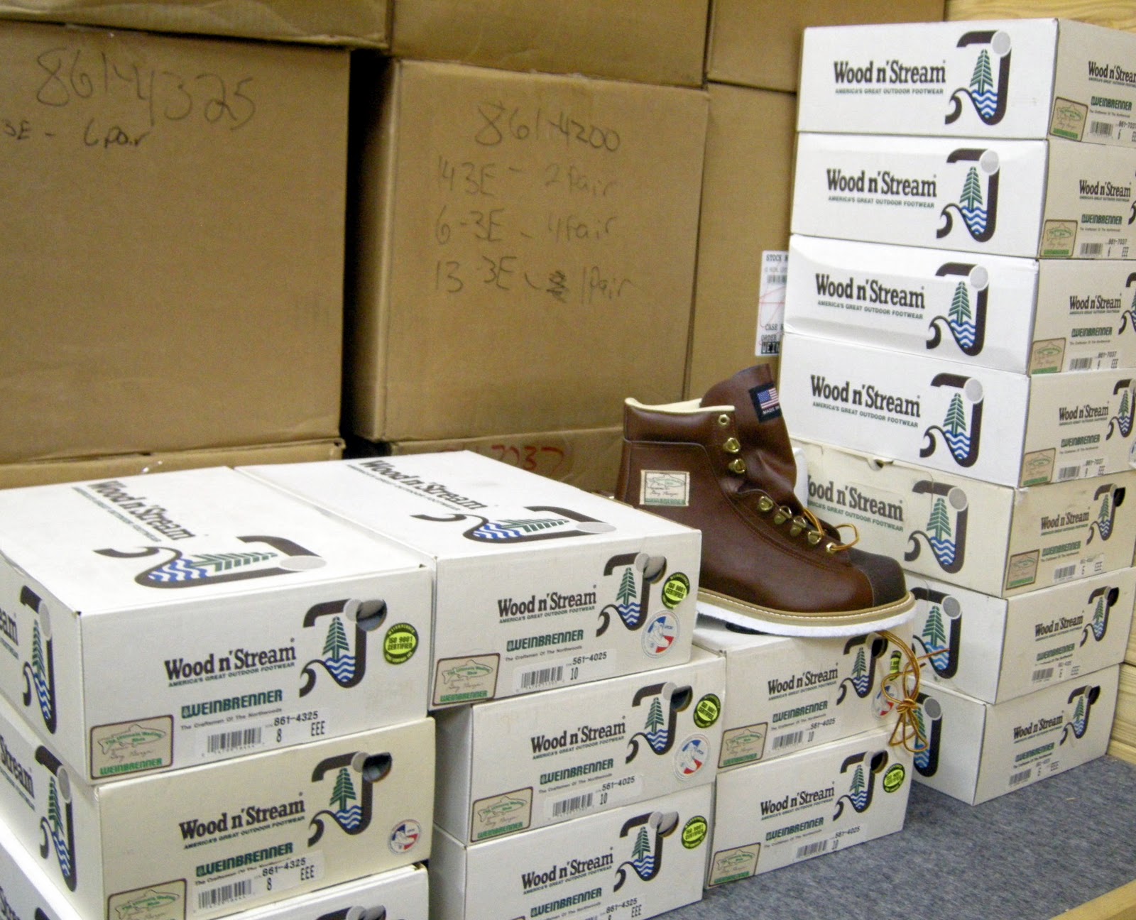 Wading Bootが入荷した。やっぱりいいね~Weinbrenner Boot・・スタッドレスの底をVibram社と言ったが、間違えた・・正しくは米国Good Year社の底に鋲が打たれたもの。大きな段ボールを運ぶだけでも大変だった(貨物総重量240kg!ワンパレット分!!)梱包されたシューズを分類し数量検査するのは休み明け火曜日に・・発送はそれからだね~